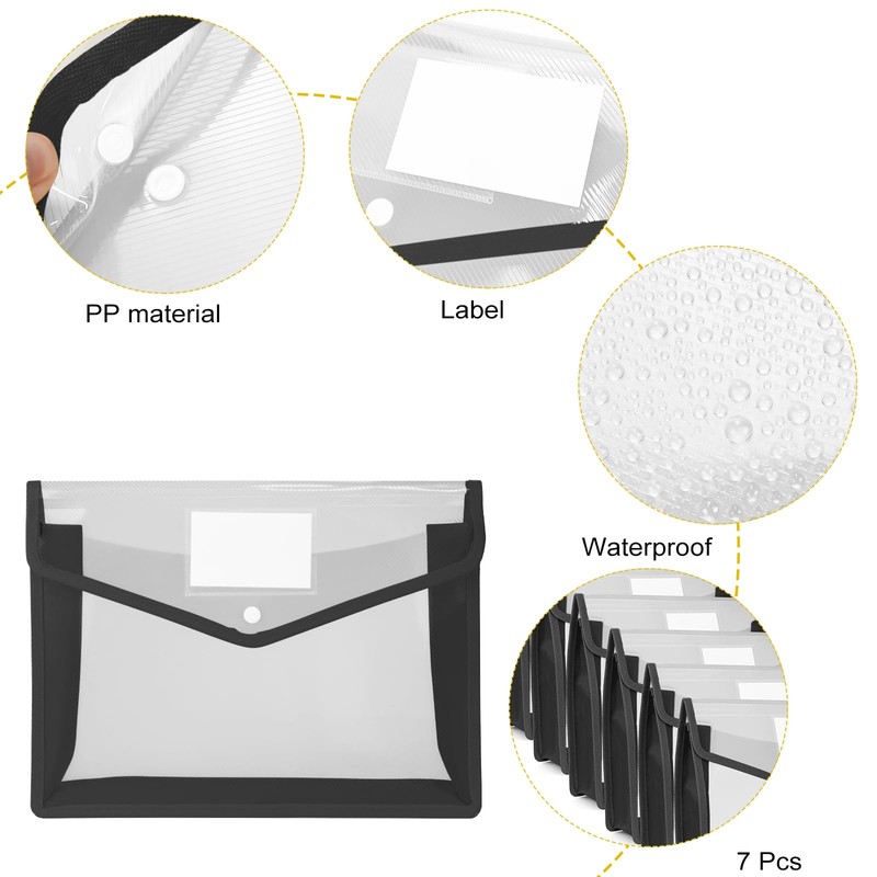 7 Pack Plastic File Folders & 200 Stickers Plastic Document A4 Folder Waterproof Pockets Files Envelope with Snap Closure Card Slot Expanding File Folder A4