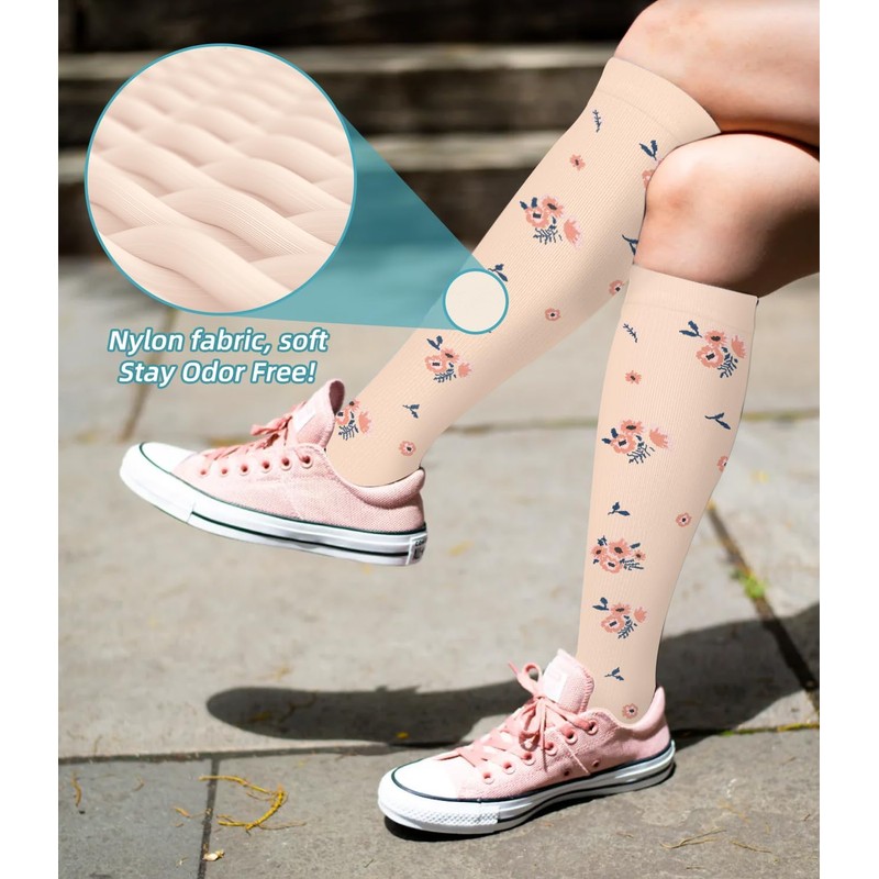 - BETTER FITTING –The material of our compression socks are upgraded with nylon percentage from 40% to 85%. Delivers 360-degree stretch for greater flexibility and durability. We carefully designed and manufactured our compression socks to provide premium support, comfort, and relief without compromising your mobility. Form fitting, lightweight, and breathable fabric features maintain joint stability regardless of activity.
