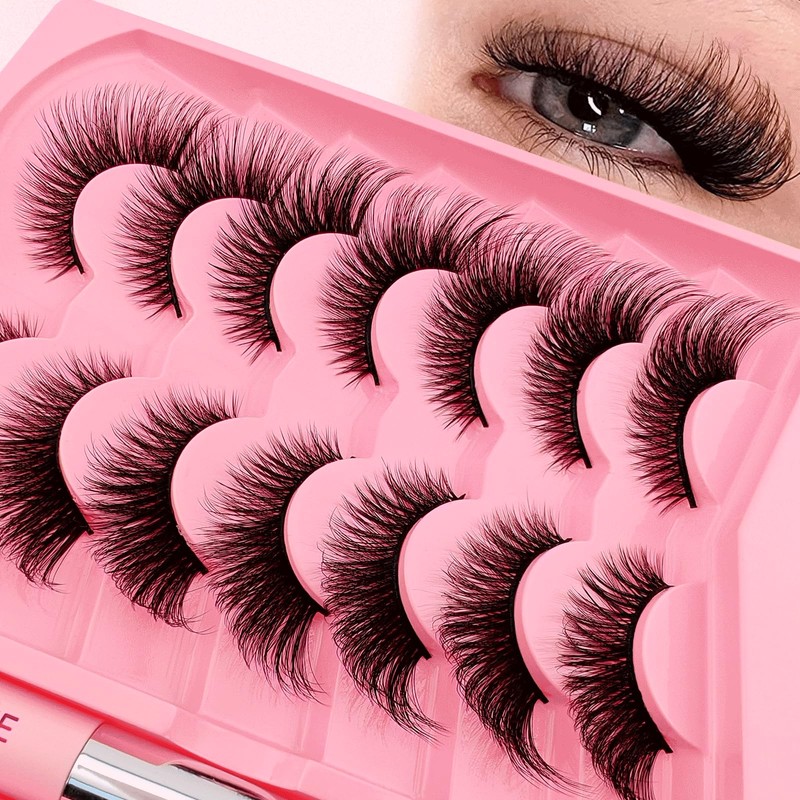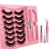 7 Pairs of 3D False Eyelashes, Cat Eye with Glue and Tweezer Kit, Fluffy Volume Curly Cat-Eye Artificial Eyelashes, Natural Look, Reusable Faux Mink Makeup Eyelashes Set (1-5 Kit)