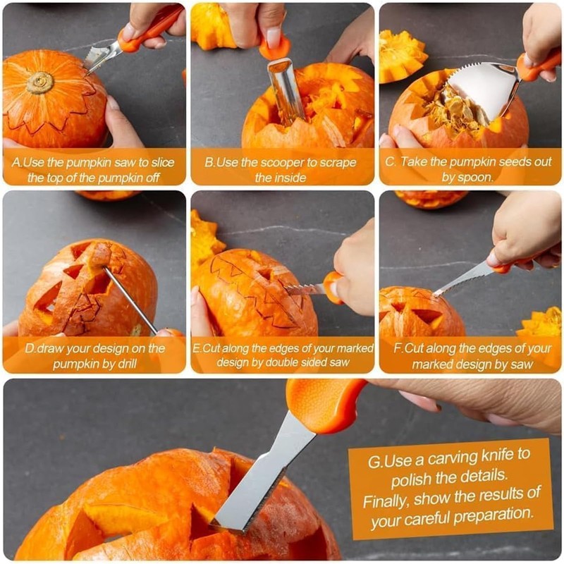 - Pumpkin Carving Tools Kit: This kit includes 1 Pumpkin Scrap Scooper, 1 V-Cutter, 1 Etching Tool, 2 Pumpkin Saws, 1 Pumpkin Drill, 1 Carving Knife, and 1 Storage Bag. It has everything you need to carve fun and creative pumpkins.