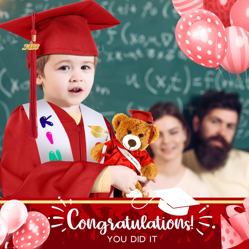 - What You Will Receive: you will receive 1 piece of kindergarten graduation gown, 1 piece of graduation cap, 1 piece of tassel, 1 piece of white shoulder strap, 1 piece graduation 2023 year charm, 1 piece graduation 2024 year charm, 1 piece of graduation plush stuffed animal toy