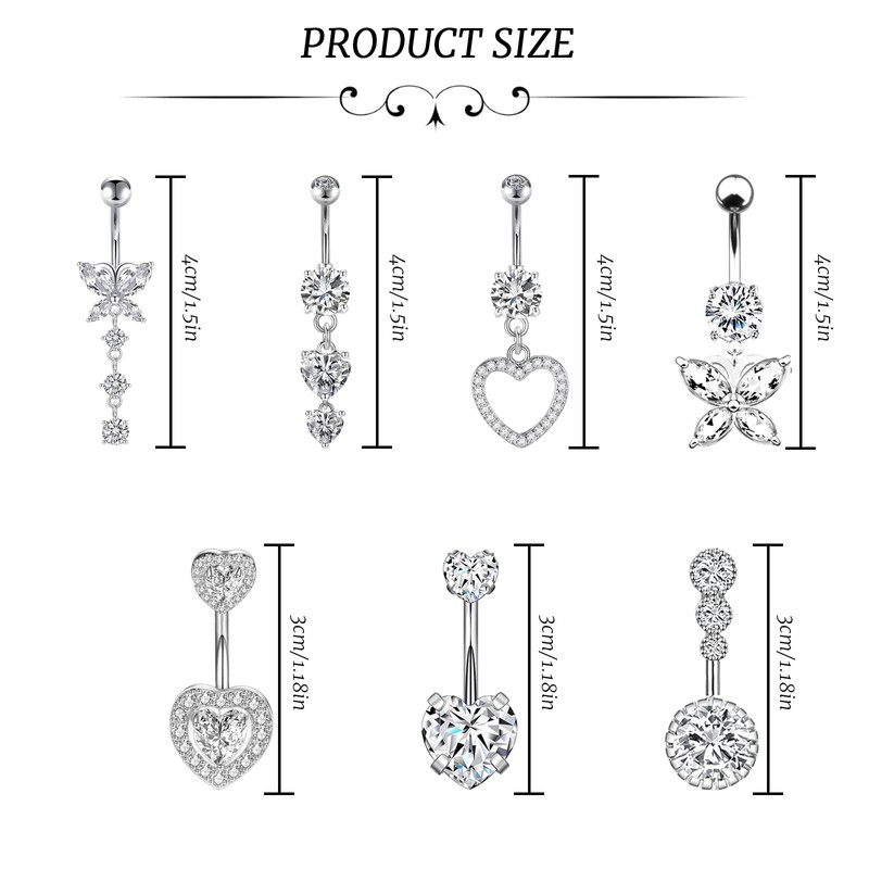 - Stylish variety: this 7-piece belly button piercing ring set contains 2 butterfly heart belly button piercings, 2 double heart double head drill belly button piercings, 2 delicate butterfly heart belly button piercings and 1 double heart zirconia belly button piercing, offers a diverse selection of styles for any occasion.