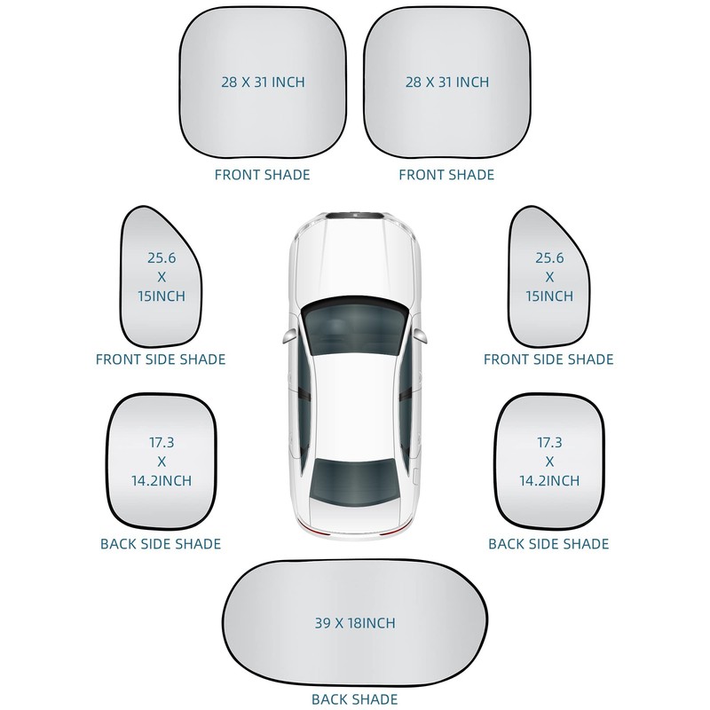 - Size Details: each front sunshade for car windshield measures about 28 x 31 inches, the rear windshield shade cover is about 39 x 19.6 inches, the car window shades for front window are about 25.6 x 15 inches and the rear side car window shades are about 17.3 x 14 inches; Note: side window sun shade can not completely cover side windows, please consider the size of the product and your own car window size, and make a reasonable choice