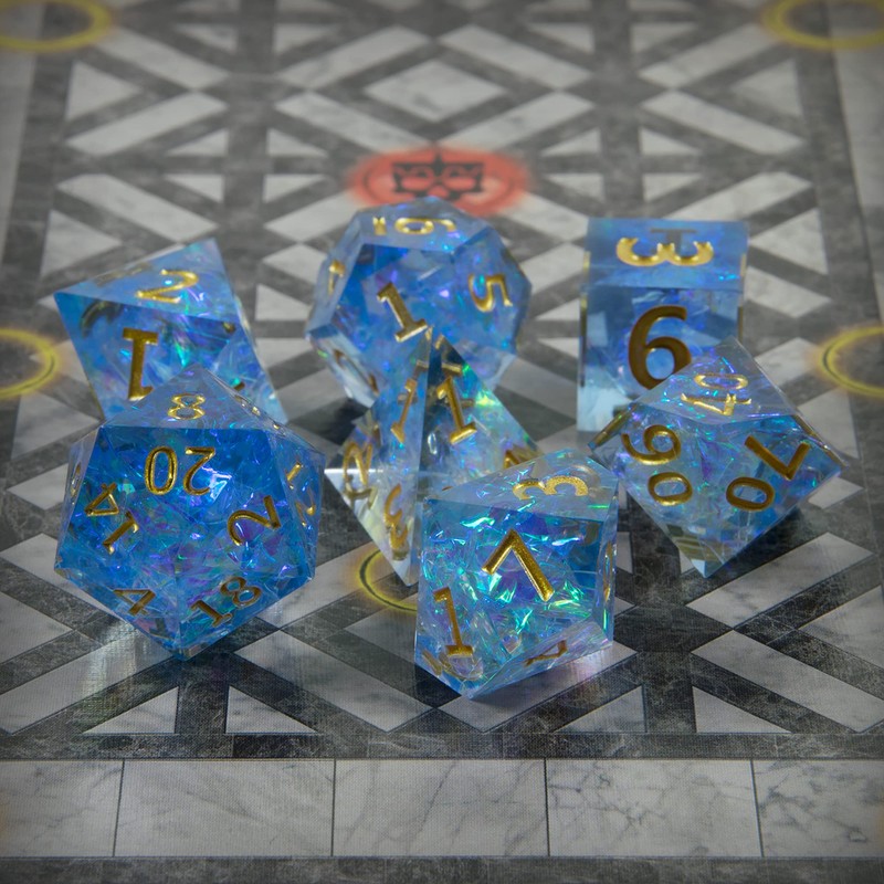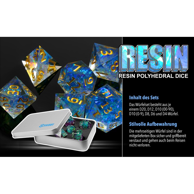- Resin dice set - The 7-piece dice set includes everything you need for a game: D20, D12, D10 (00-90), D10 (0-9), D8, D6 and D4 dice