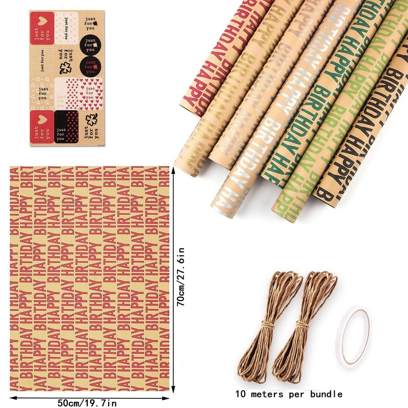 7 Sheets 19.7 x 27.6 inch Birthday Wrapping Paper Roll, Happy Birthday Wrapping Paper Kraft with 13Stickers and 66Ft String Recyclable