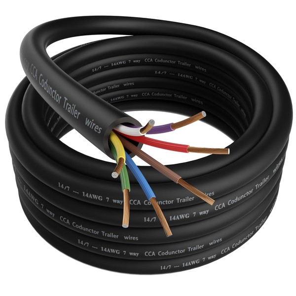 - 【14 Gauge CCA Trailer Wire】: This 7-conductor trailer wire uses high-quality and cost-effective 14awg copper clad aluminum (CCA) conductors for enhanced power delivery. Each 14 gauge conductor delivers consistent electrical performance for all 12V trailer connections, minus the unnecessary cost.