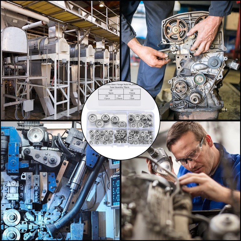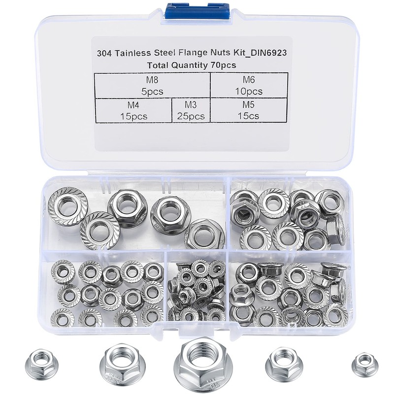- Package Includes: You will receive 25 pcs M3, 15 pcs M4, 15 pcs M5, 10 pcs M6, 5 pcs M8, a total of 70 pcs stainless steel flange nuts. The flange nuts with serrations according to DIN 6926 are a modified version of flange nuts following DIN 6923.