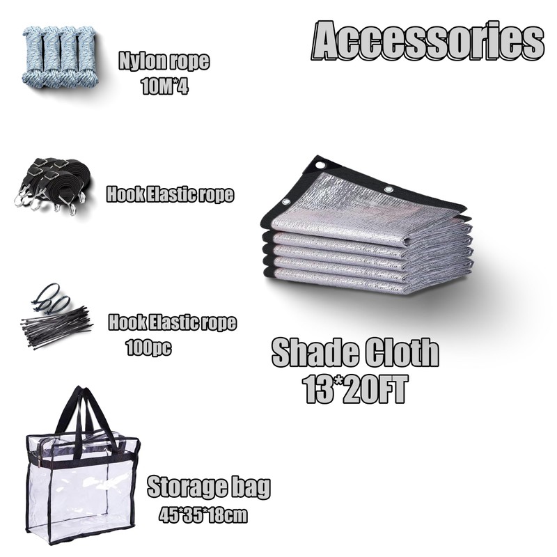 - Complete Shade Cloth Kit - Our aluminum foil shade cloth comes with all the accessories you need for installation and usage. In addition to the shade cloth itself, customers will also receive four bundles of ropes, a pack of ball head bungee cords, adjustable-length bungee cords with hooks, a pack of nylon zip ties, and a transparent storage bag for convenient organization and storage.