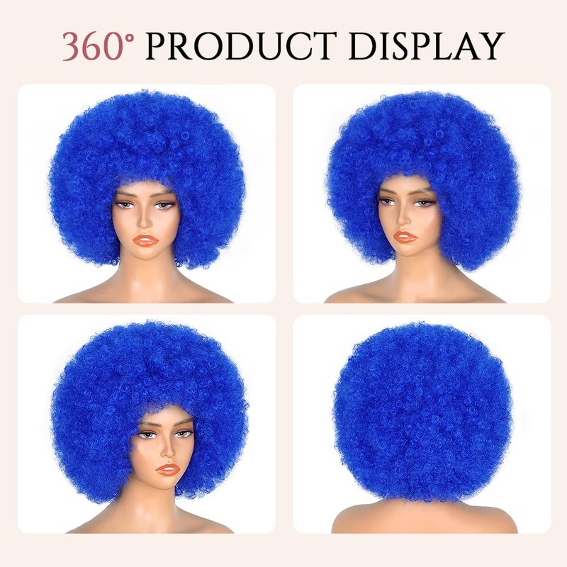 70's Afro Wig for Women, Blue Short Afro Kinky Curly Wig, Glueless Synthetic Wig with Bangs, Puffy & Fluffy Bouncy Afro Wig for Daily Cosplay Party