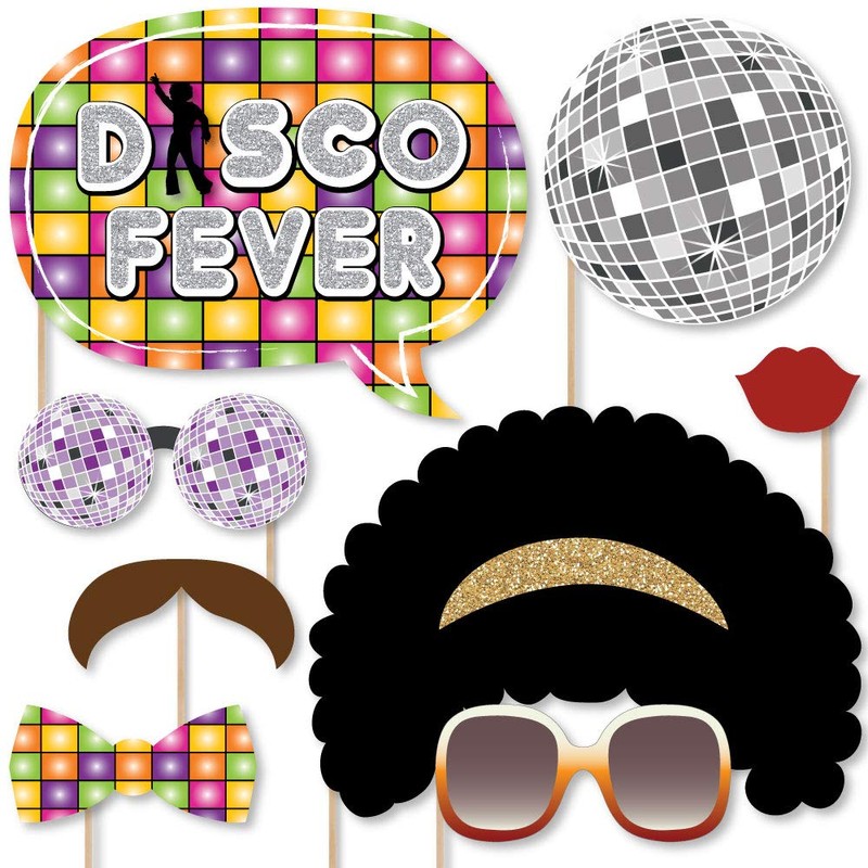 - 20-Piece Disco Fever Photo Booth Props Kit INCLUDES 20 70's Disco photo booth props, 20 wooden dowel sticks and adhesives for assembly. EASY ASSEMBLY: Simply attach the printed DIY photo booth props to the wooden dowels with included adhesive and reinforcing stickers.