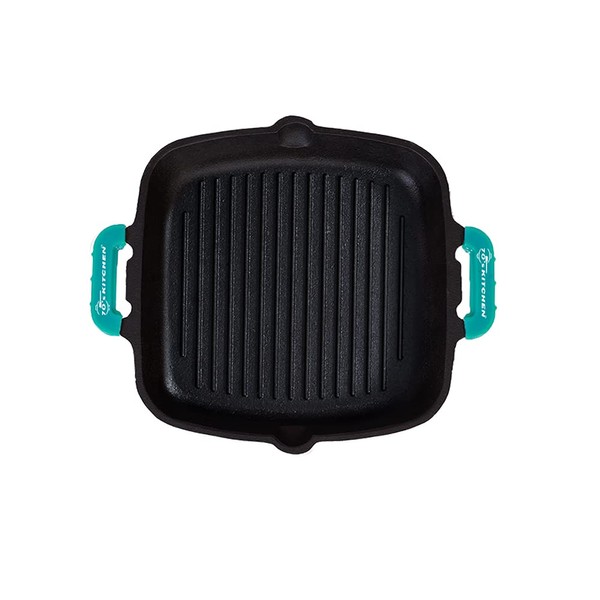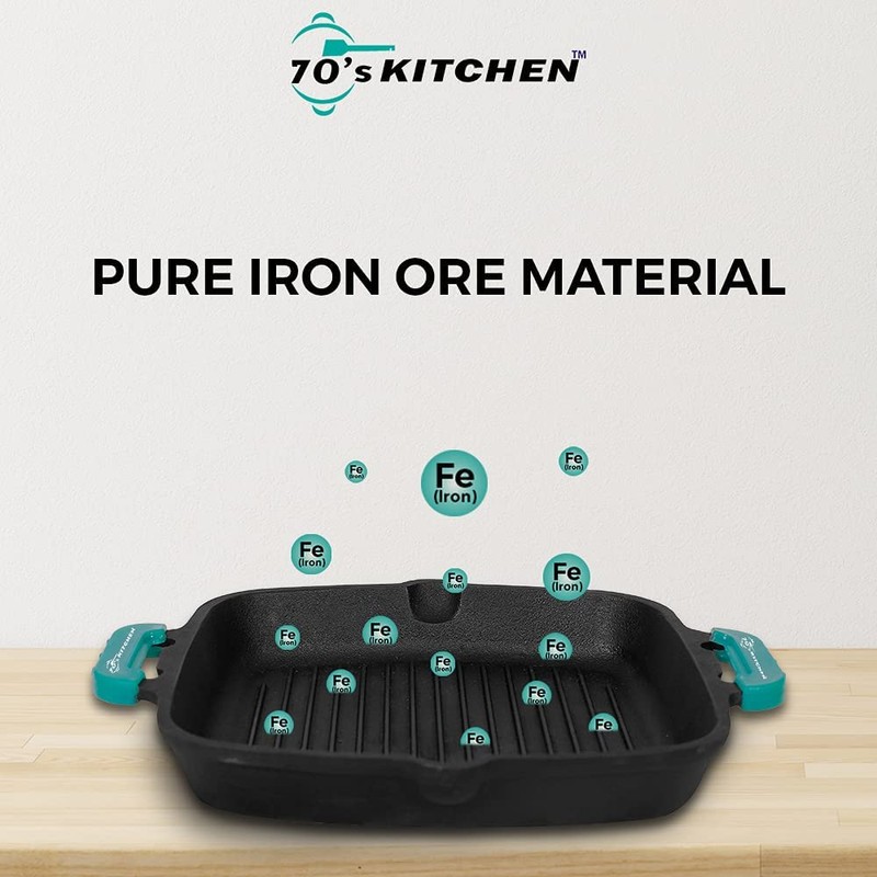 - As iron deficiency is more common these days, food prepared in a cast iron will helps your body with iron intake and also experience the enhanced taste in your preparation. Our 70's kitchen grill pan comes with a silicon handle (removable) cover that makes it simple to transfer the pan from the stovetop to the table.