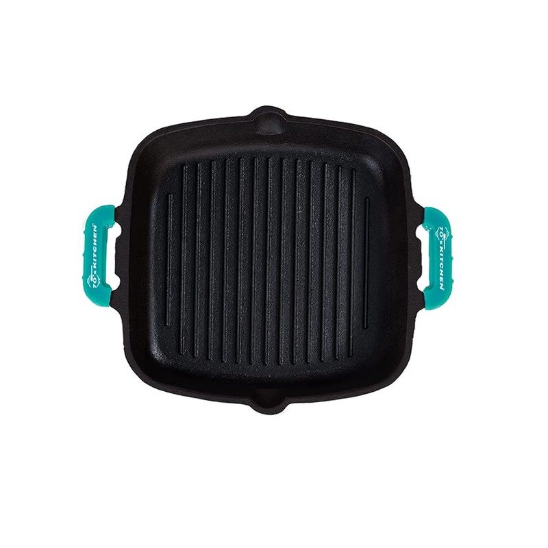 70'S KITCHEN Cast Iron Grill Pan with Silicon Handle for Cooking - Pre-Seasoned, 10.8Inch, Black