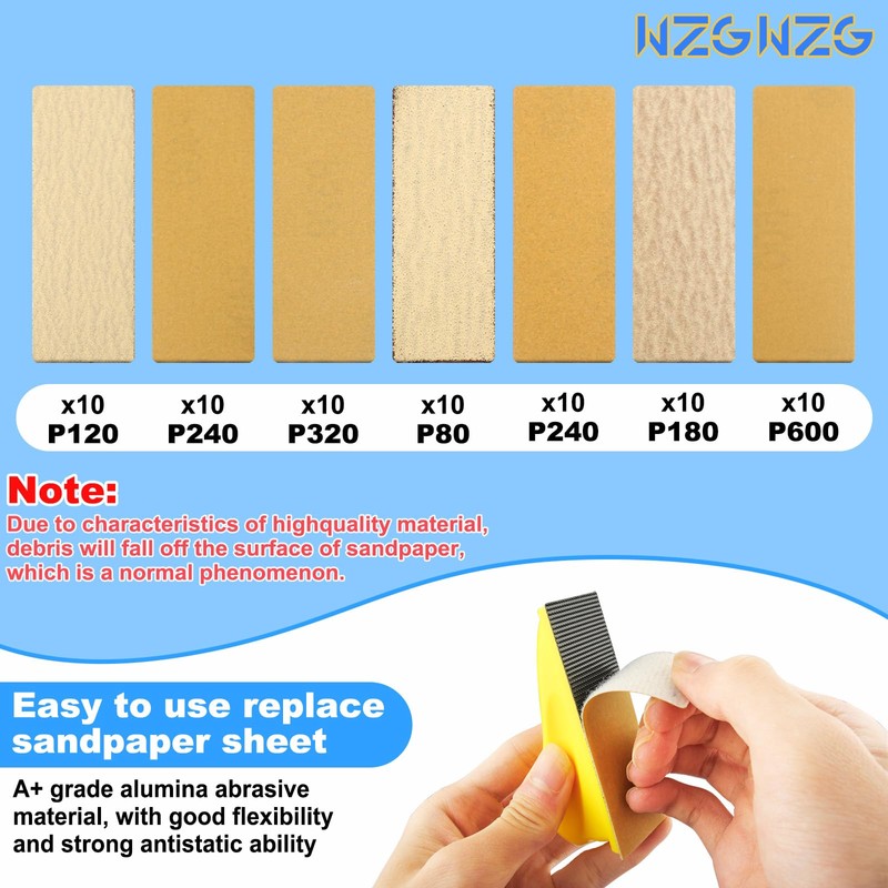 This sander paper set includes a 3.5 inch x 1 inch hand sanding block, and 70 sheets purple back velvet water micro detail sander paper.