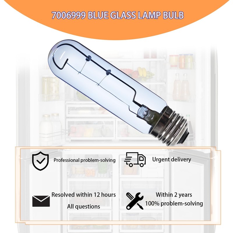 - Specification of refrigerator light bulb:7006999 blue glass lamp reformer light bulb: 1.Light efficiency:2.82 watts 2.Power factor:1 3.Service life:about 1500 hours 4.Color temperature:2600K 5.Color rendering index:85.6 6.Rated voltage:120V 7.Rated power:40W And the 7006999's sturdy construction ensures longevity so you can enjoy reliable lighting inside your refrigerator for a long time.Convenient installation,significant power saving,reducing your monthly electricity bill.