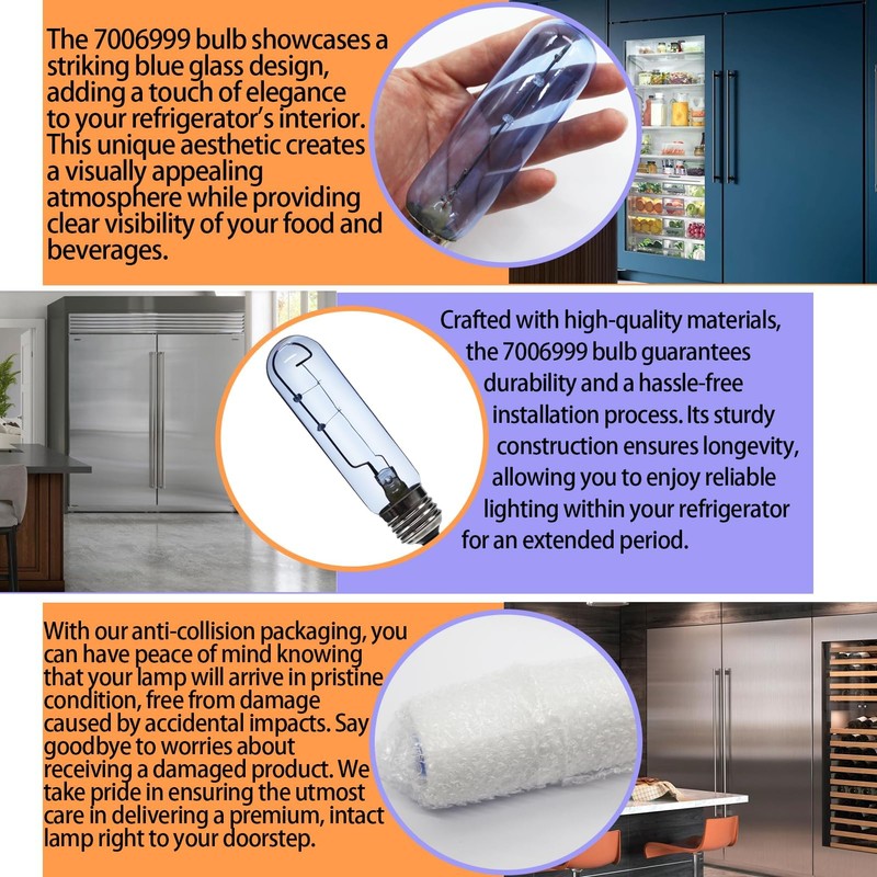 - Fix the problem:The 7006999 bulb was made with durability and the installation process in mind, it is designed for easy installation, allowing you to quickly replace your existing bulb, the 7006999 is a tried and true solution to inadequate or failing lighting inside your refrigerator, it has a super long working life, minimizing the need for frequent replacement and refrigerator to restore optimal lighting inside your refrigerator