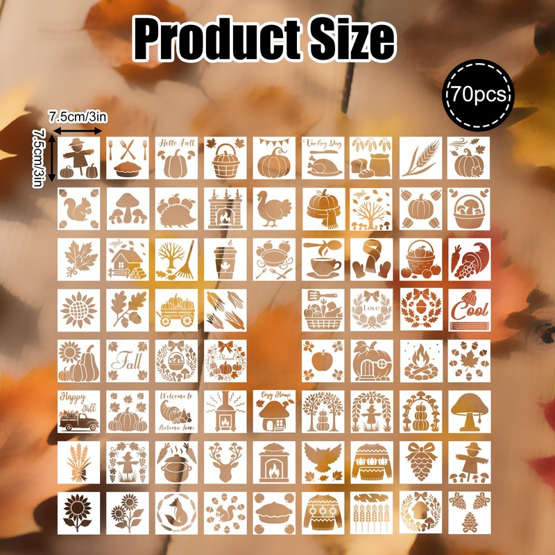 • Product Content: You will receive 70 autumn painting stencils with a size of 7.5x7.5cm/3x3in. Sufficient quantity can meet your painting use, matching and replacement needs, and can also be shared with friends.