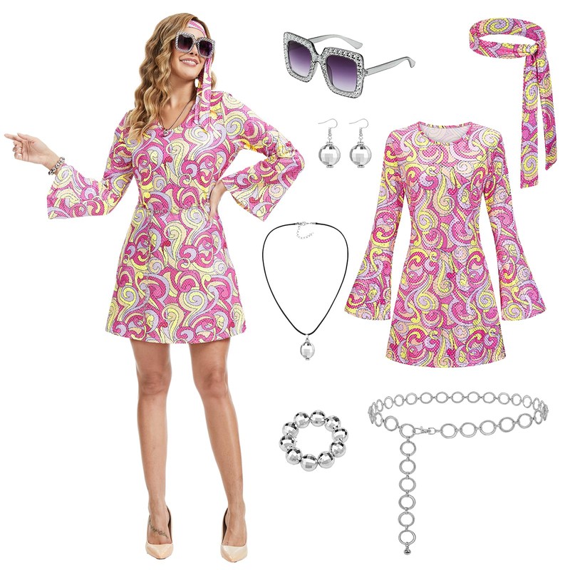 - 70s outfits for women: 7 piece Hippie costume includes: 70s Disco Dress*1, 70s Disco headband*1, 70s Disco glasses*1, Disco ball earrings*1, Disco ball necklace*1, Disco ball bracelet*1, Fashion waist chain*1.