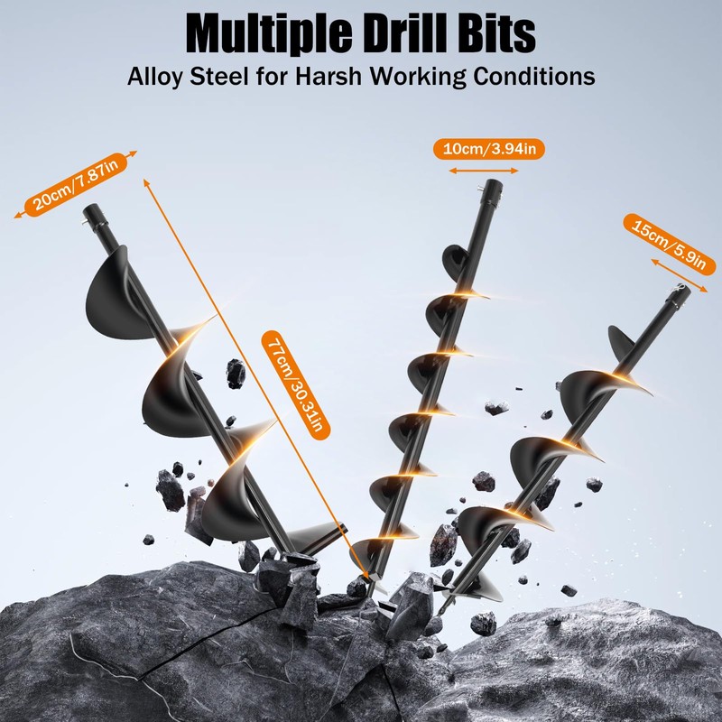 - Multiple Drill Bits: Alloy steel drill bits can withstand harsh working conditions such as impact, compression, and material-wear well. The different diameters (3.94in; 5.9in; 7.87in) and suitable lengths(30.31in) are widely used in various excavation projects to meet different drilling requirements