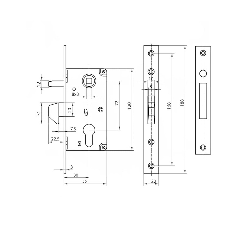 - Backset – 30 mm, square – 8 mm, distance – 72 mm, depth (without hook) – 57 mm, weight – 460 g, without cylinder, with screws