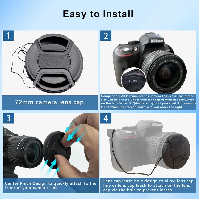- Suitable: the protective cover can be used with all lenses of etc. When purchasing, please pay attention to which front diameter your lens has. From camera lens with 72 mm filter thread