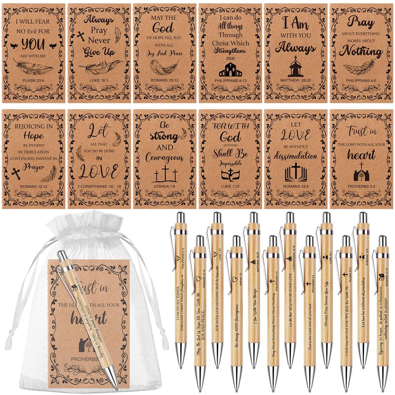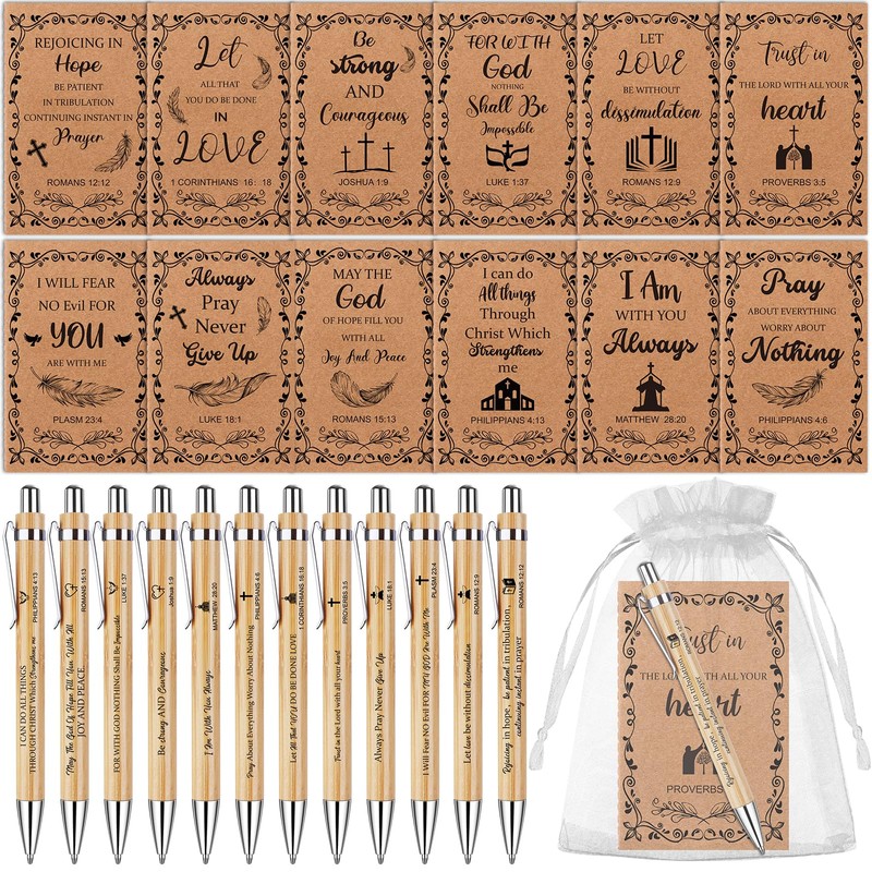 - Package Includes: you will receive 24 Bible verse pens, 12 styles, 2 each; 24 religious scripture notebooks, 12 styles, 2 each; 24 white organza bags, total 72 Christian gifts. Ample quantity and multiple style combinations can meet your use, replacement and gifting needs