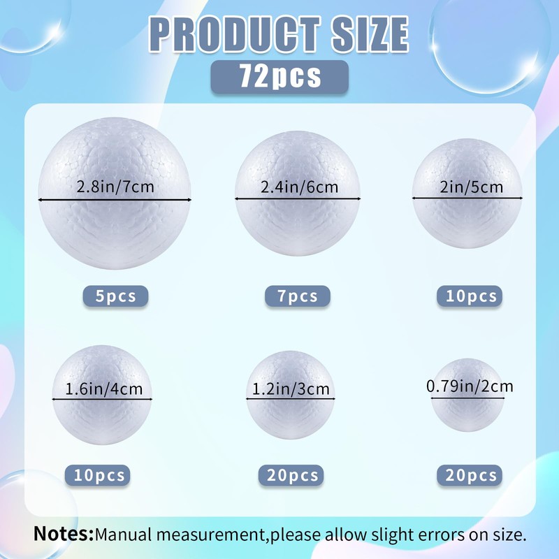 - Package: 72 pieces foam balls in 5 sizes which are 2cm/0.8inch x 20pcs, 3cm/1.2inch x 10pcs, 4cm/1.6inch x 10pcs, 5cm/2inch x 10pcs, 6cm/2.4inch x 7pcs., 7cm/2.8inch x 5pcs. These foam balls can meet your many different needs.
