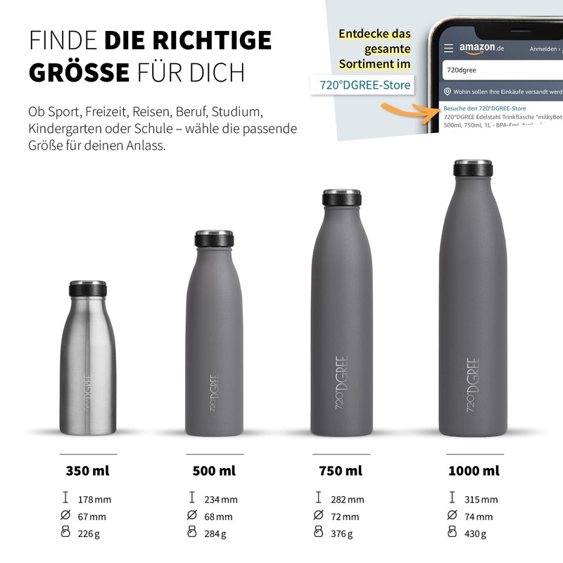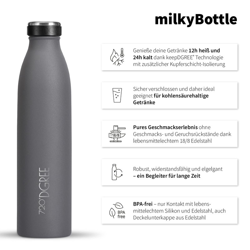 - ✔ DU BIST 100% ZUFRIEDEN ODER GELD ZURÜCK - Sei dir deiner Investition sicher. 720°DGREE steht für HERAUSRAGENDEN DEUTSCHEN KUNDENSERVICE mit tausenden GLÜCKLICHEN KUNDEN. Falls du die "milkyBottle" nicht absolut lieben solltest, schicke diese einfach innerhalb von 60 Tagen zurück und wir erstatten dir den vollen Betrag - ohne Wenn & Aber! Lege dir deine Premium Isolierflasche JETZT in den Einkaufswagen.