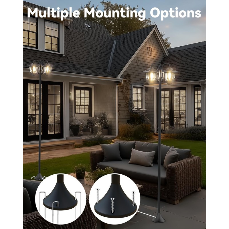 - Package Includes : 1x 73" Solar Post Light (3-head), 2x Spare LED Bulbs,U-shaped steel stakes + Concrete Mount Kit, Installation Guide