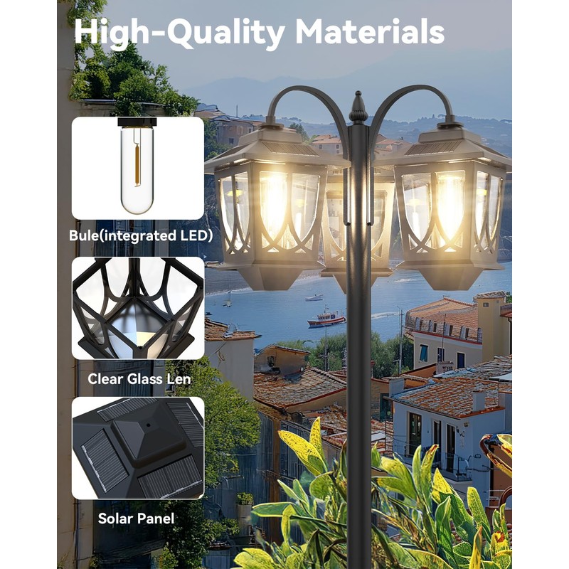 - Premium Durable Build : Thickened aluminum pole,UV-resistant ABS lamp covers,The pole has been premium to thickened Aluminum material these solar lamp post lights offer exceptional durability and weather resistance, ensuring long-lasting performance even in the toughest outdoor conditions.Ideal for year-round use in gardens, driveways, and patios.WARNING: This heavy-duty solar light is expressly prohibited from installation on unstable surfaces (e.g., sand/loose soil).