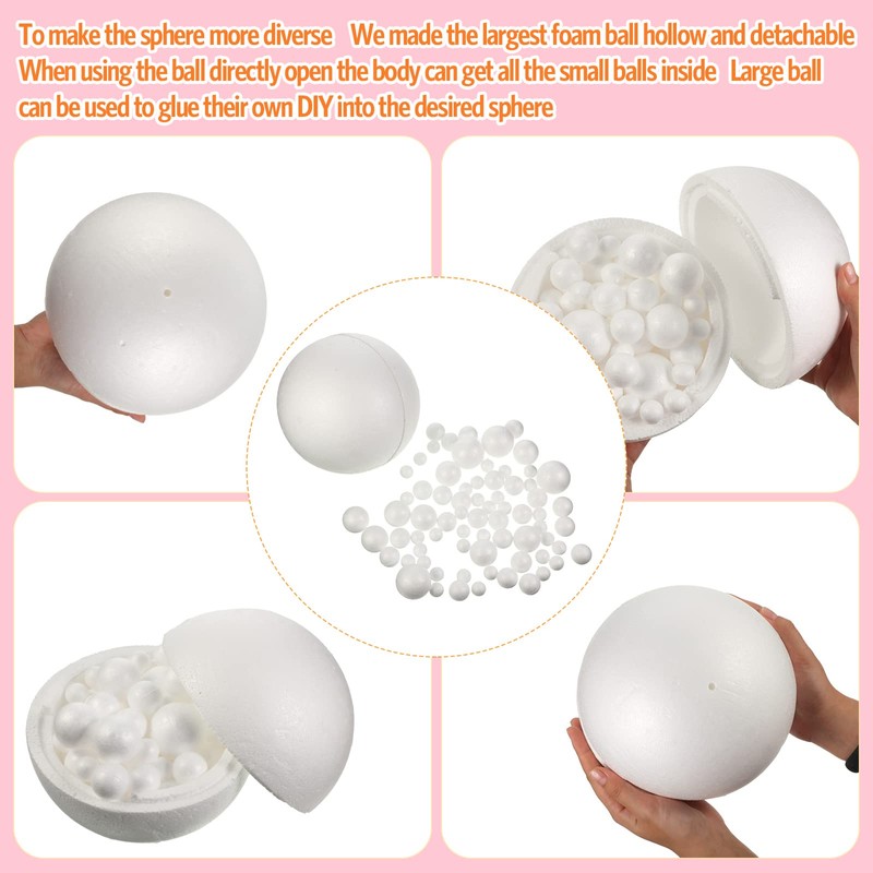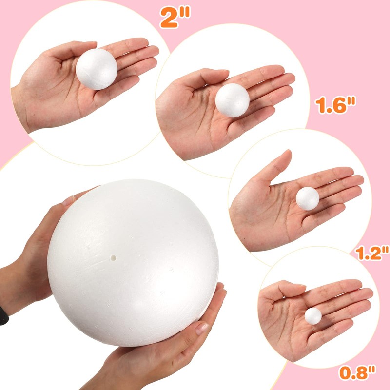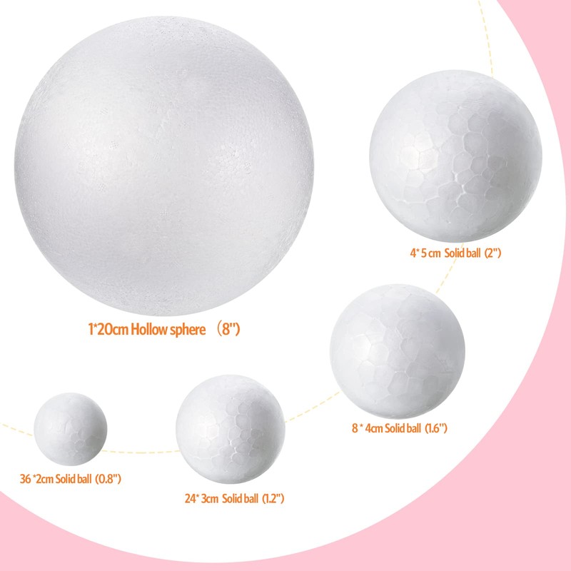 - Nice Combination for Convenient Use: you will receive 73 pieces of foam ball, including 1 piece of 8 inch hollow foam ball, 4 pieces of 2 inch small foam balls, 8 pieces of 1.6 inch white foam balls, 24 pieces of 1.2 inch foam balls for craft and 36 pieces of 0.8 inch foam balls; They are sufficient and various for you to choose and decorate