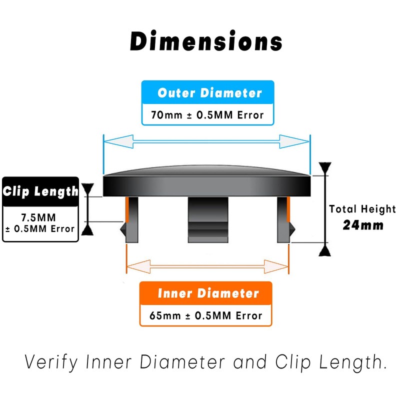 - ★Size: Outer Diameter: 74.5mm/2.93in, Inner Diameterr: 70mm/2.76in, Clip Length: 15.5mm/0.61in, Total Height: 20mm/0.791in. Please use a digital caliper to check your original cap dimensions if you are not sure. If you are not sure about the size, please feel free to contact us.