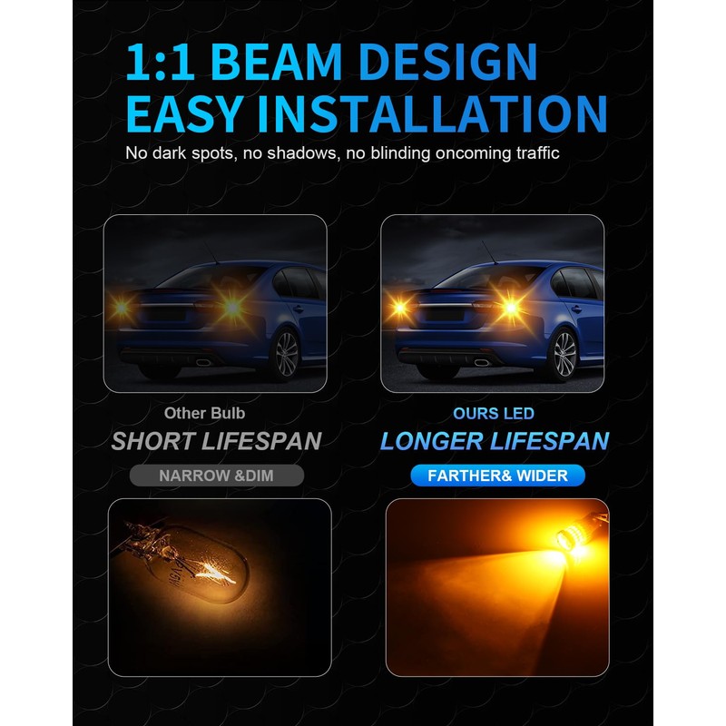 • 【Wide Application】 The 7443 7440 LED bulbs W21/5W car bulb compatible for turn signal lights, tail lights, parking lights, side marker lights, daytime running light bulbs etc.