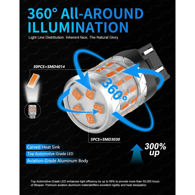 • 【360° Lighting】7443 W21/5W LED bulb adopts an innovative 360° lighting design, and a more concentrated beam. 360° full angle illumination light output, more than 300% brighter than original bulb. It can provide a wider light coverage, enhance light penetration, and far exceed the performance of traditional halogen lamps.