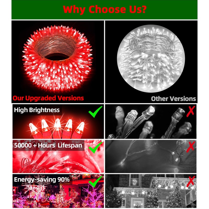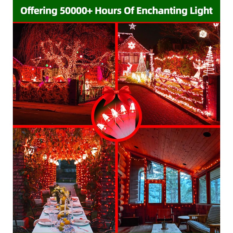 - Create mesmerizing holiday magic with super long dazzling LED brilliance. Powered by upgraded high-lumen chips, these lights transform gardens, patios, or event venues into ethereal wonderlands. Perfect for weddings, parties, or everyday enchantment, they deliver galaxy-like radiance that turns any space into a luminous masterpiece