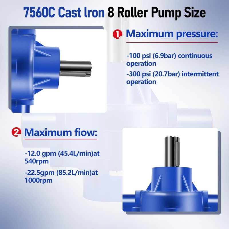 - Maximum Values for the 7560C Cast Iron 8-Roller Pump:MAX.Fluid Tempereture:140°F/60°C, Max. Flow Rate (GPM [LPMJ):22.5 [85.2], Max.Pressure(PSI [BAR]):300 [20.7], Max RPM:1000 Avoid exceeding the maximum values whenever possible.