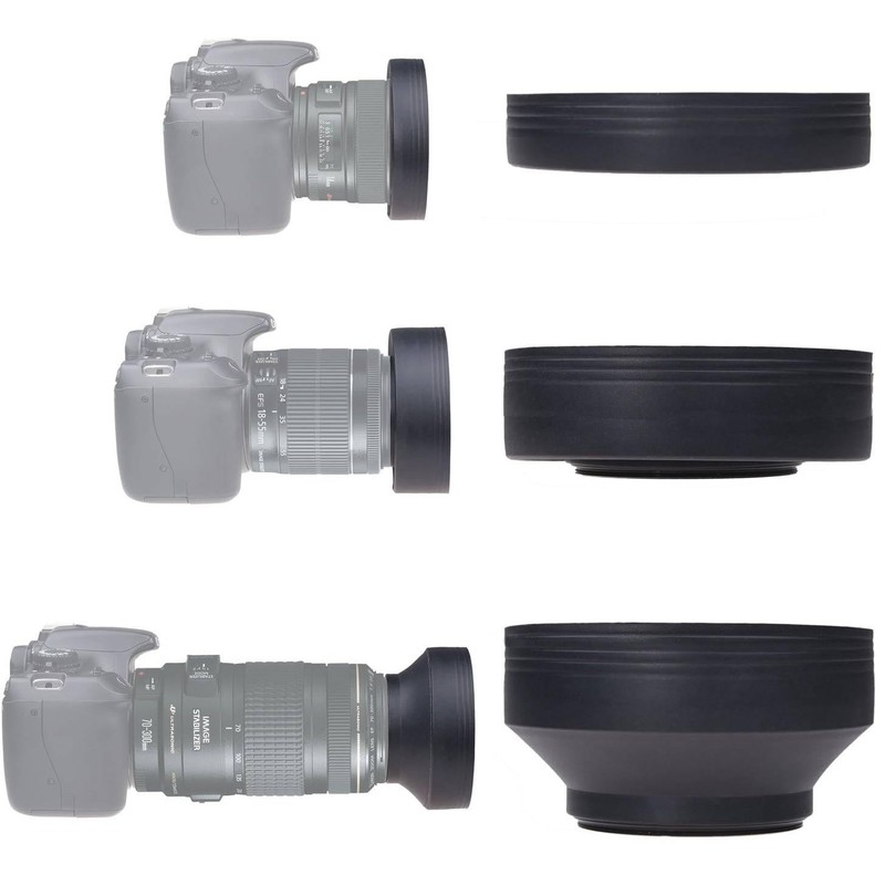 - COLLAPSIBLE IN 3 STEPS The rubber lens hood can be folded out in 3 steps to offer different levels of sun shading. Because the rubber lens hood can be fully collapsed, you can leave it on your lens so you can always use it when you need it.
