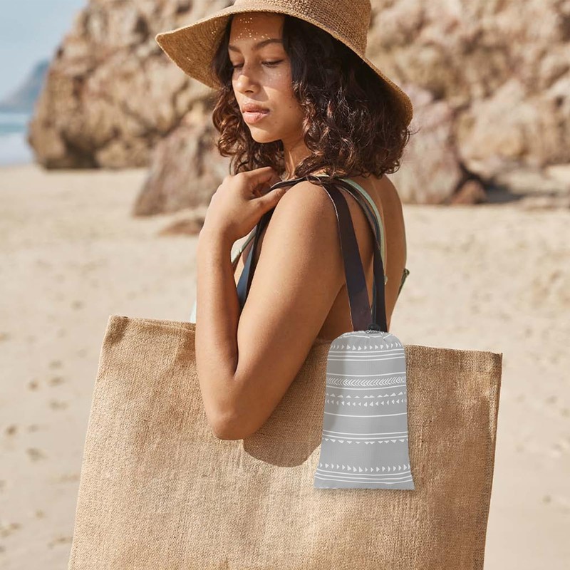 - No Blowing Away: Our gray geometric style beach blanket comes with 4 anchor stakes and 4 sand pockets. On windy days, if you don't have a lot of stuff on your beach mat, just fill the built-in corner pockets with sand to weigh it down or use the four included stakes to keep it in place.