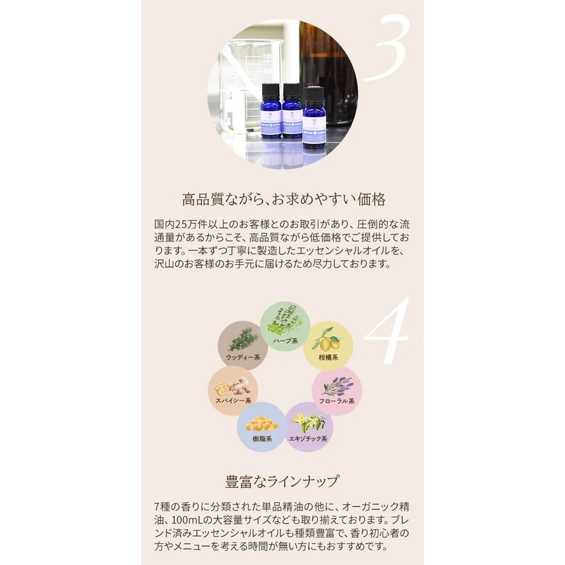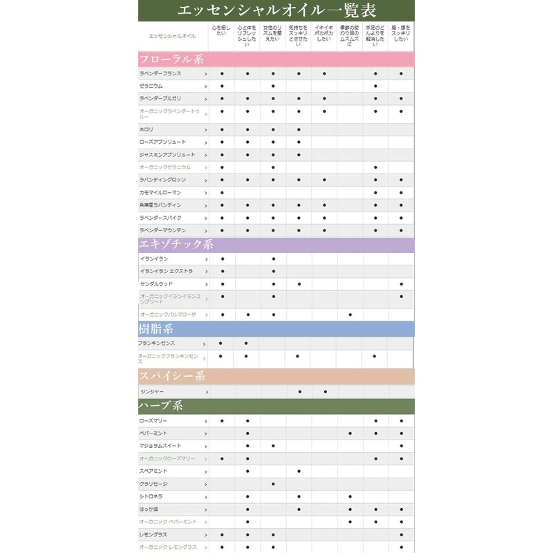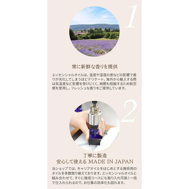 - [How to use] Treatment: Dilute the concentration when diluting with carrier oil (vegetable oil) at less than 1% before using. Add in the salon space: Use a fragrance, or add boiling water into a bowl or tea cup and place 1-5 drops to spread the aroma. Create a relaxing space from the moment you open the entrance. ■ Add to your beauty supplies: Simply drop 1 to 2 drops of essential oils into the cotton and place it in the closet or massage bed pillow to store towels, gowns, etc. Country of Origin: Japan