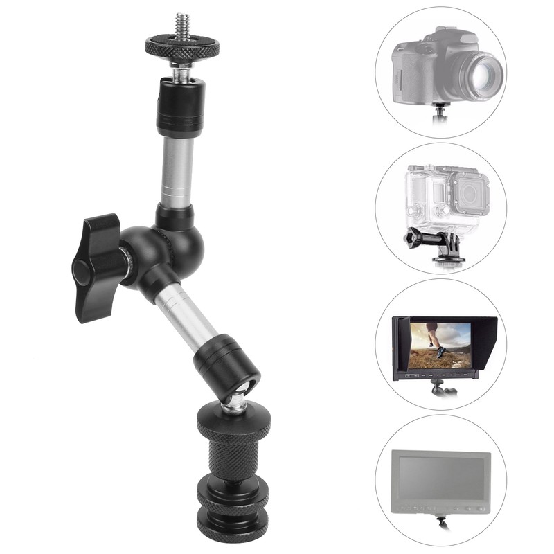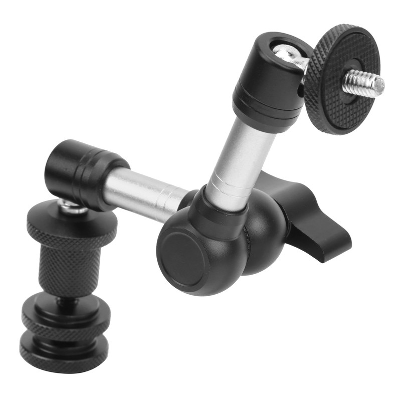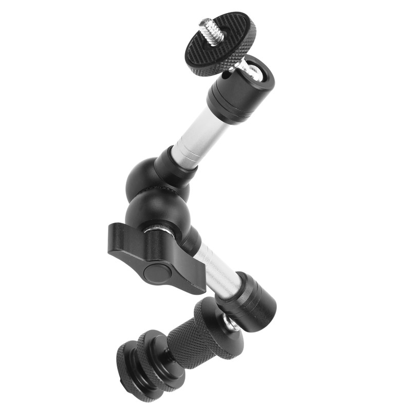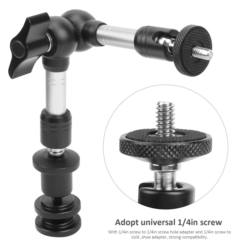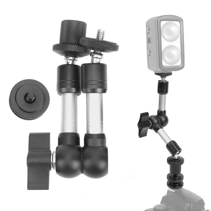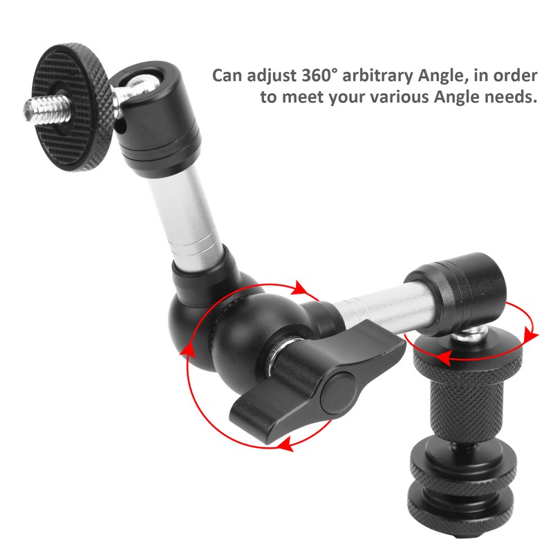 1、The body is made of aluminum alloy, strong and durable, and the surface is painted anti‑corrosion and anti‑oxidation. 2、Adopt universal 1/4in screw, with 1/4in screw to 1/4in screw hole adapter and 1/4in screw to cold shoe adapter, strong compatibility. 3、Can adjust 360° arbitrary Angle, in order to meet your various Angle needs. Suitable for camera, LCD monitor, fill light and so on. 4、Using the latest one‑key locking, a single damping can lock all three axes simultaneously. 5、This magic arm is with precise design, allows universal mounting options. Practical and convenient.