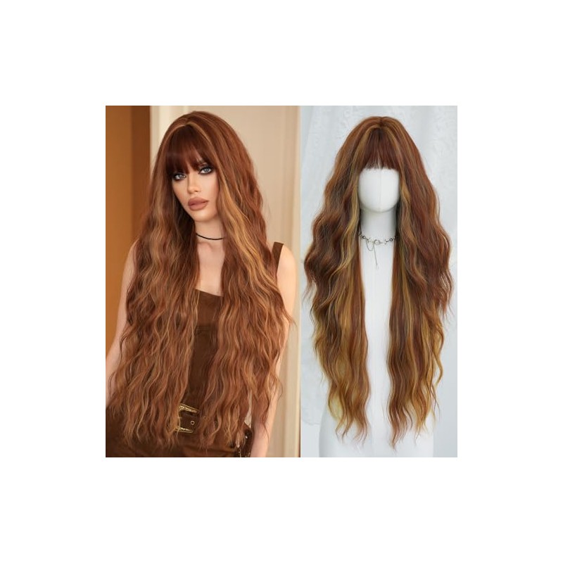 7JHH WIGS Long Loose Wavy Reddish Brown Highlight Blonde Wigs with Bangs Wet and Wavy Long Curly Heat Resistant 150% Density Culry Wave Wig for Women Daily Used