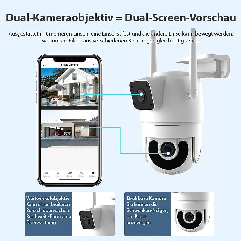 • 1 pan-tilt lens for 360° all-round view, 1 fixed lens: no blind spot. Two 3 MP sensors for videos in 2K from both lenses, night vision in colour. Noise and person detection, motion detection with definable area. Object tracking and patrol function as well as integrated siren with 90 dB. Free app "ELESION". " for worldwide worldwide Access, live picture display and much more. Record to memory card and intercom function via your smartphone