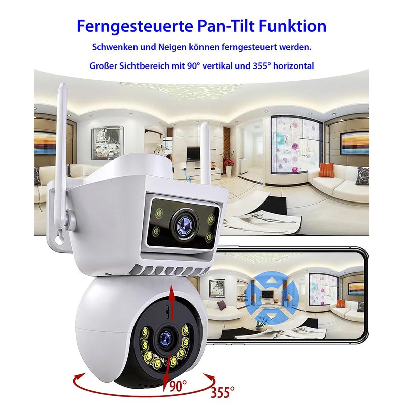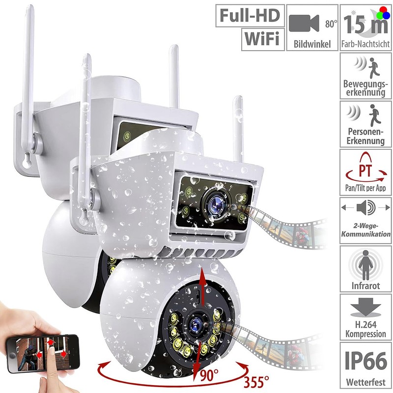 - Dual full HD camera with dark light technology for colour night shots. 1 x pan-tilt lens and fixed lens for full 360° all-round view without blind spots. Motion and person detection, with switchable tracking. With H.265 for high-resolution videos, intercom function and SD recording. Free ELESION app for worldwide train. live picture Display and much more. LAN port as well as dust and waterproof housing IP66
