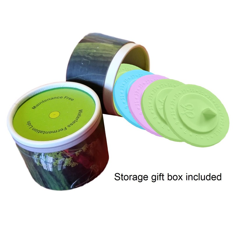 7pack Maintenance free airlock waterless fermentation lids for wide mouth mason jars. Make Sauerkraut, Kimchi, Pickles, any fermented vegetable probiotic foods. BPA free, mold free, dishwasher safe.