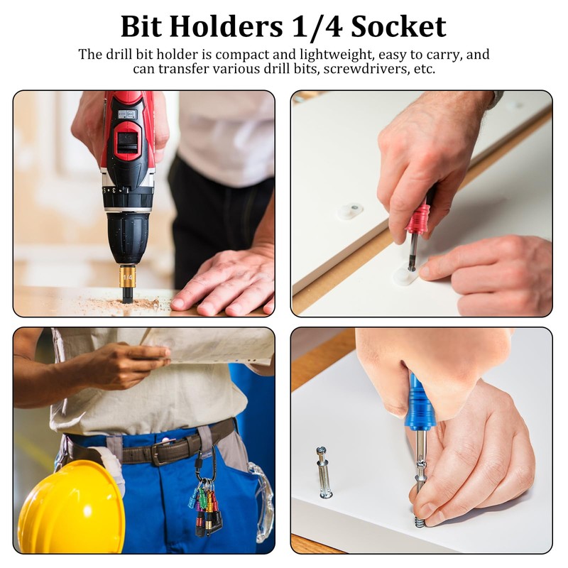 - 【 1/4-inch Hex Shank Bit Holder】The package includes a 7pcs 1/4 inch hex shank drill bit holder keychain extension bar with black metal carabiner. These extensions are compatible for most 1/4-inch hex shank, hex sockets, electric screwdrivers, handheld screwdrivers, and drills.