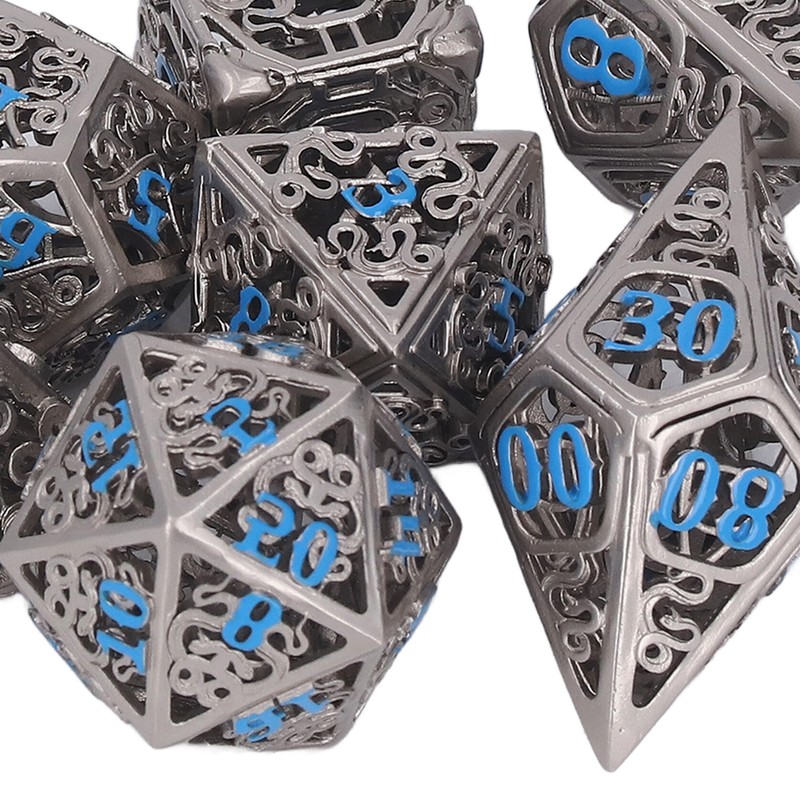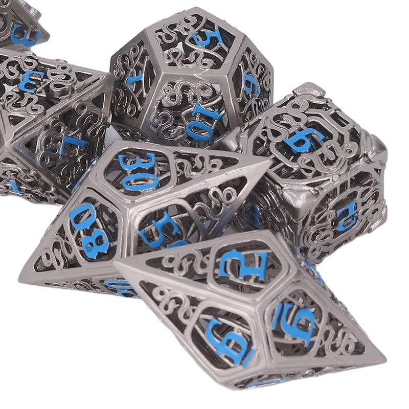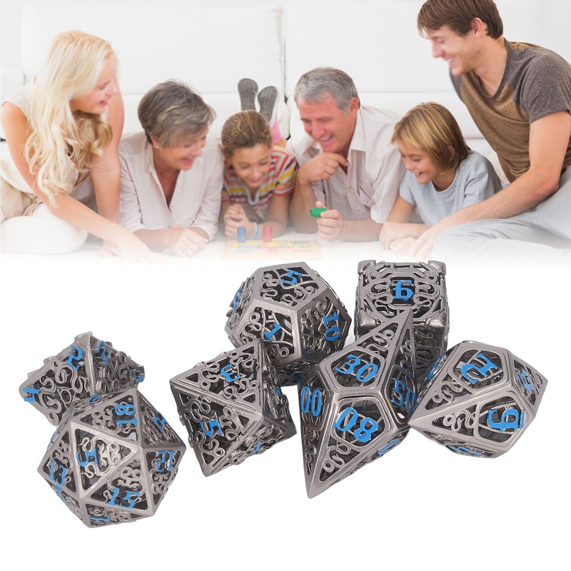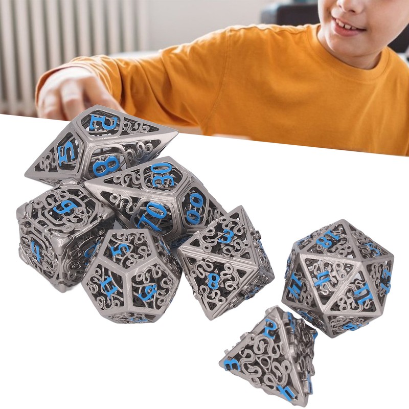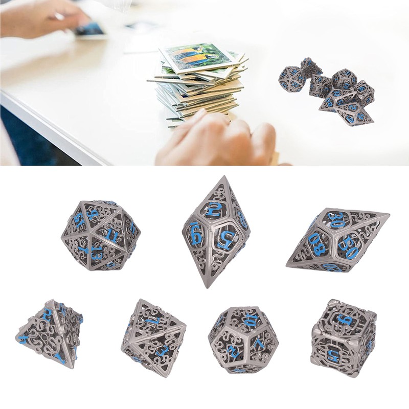 7pcs Hollow Dice Set Brass Rolling Beautiful Polyhedron Dices with Blue Numbers for Games