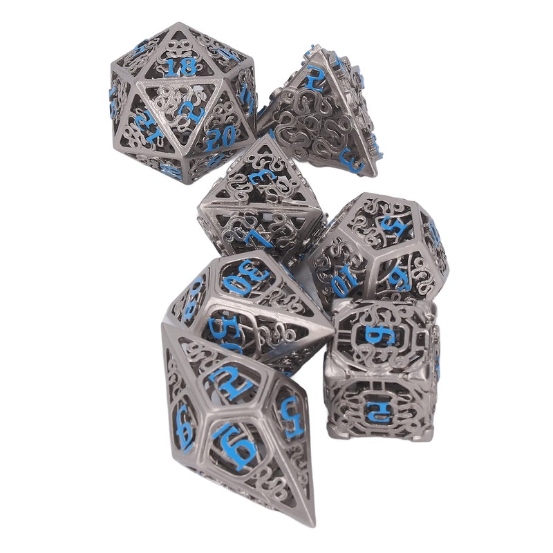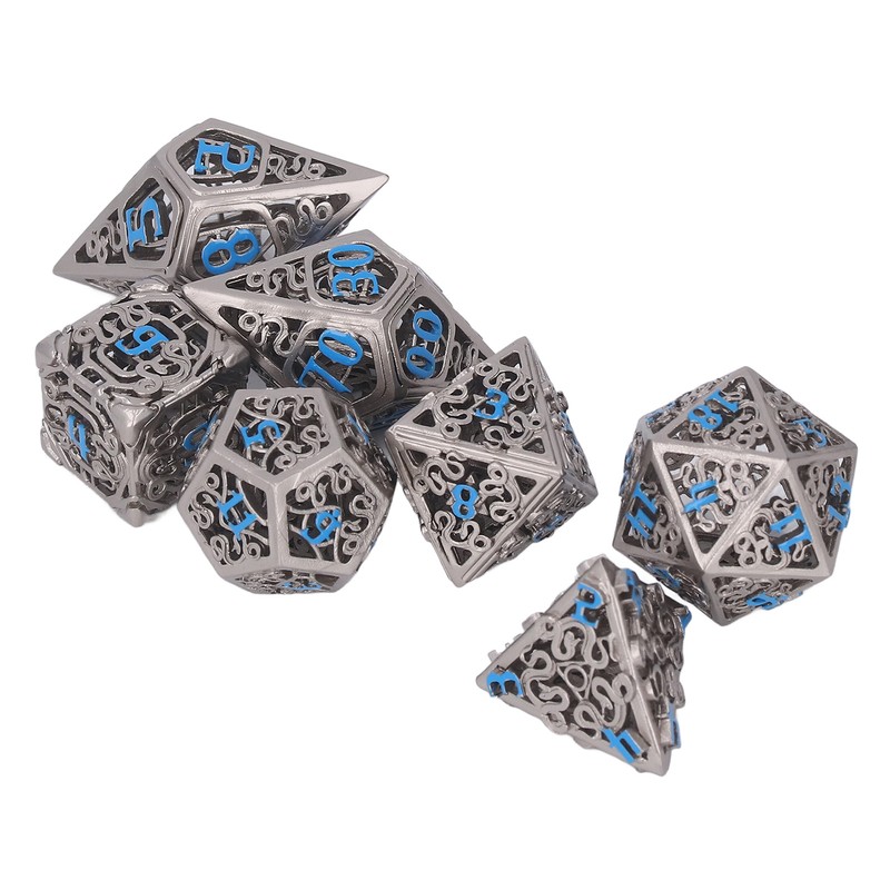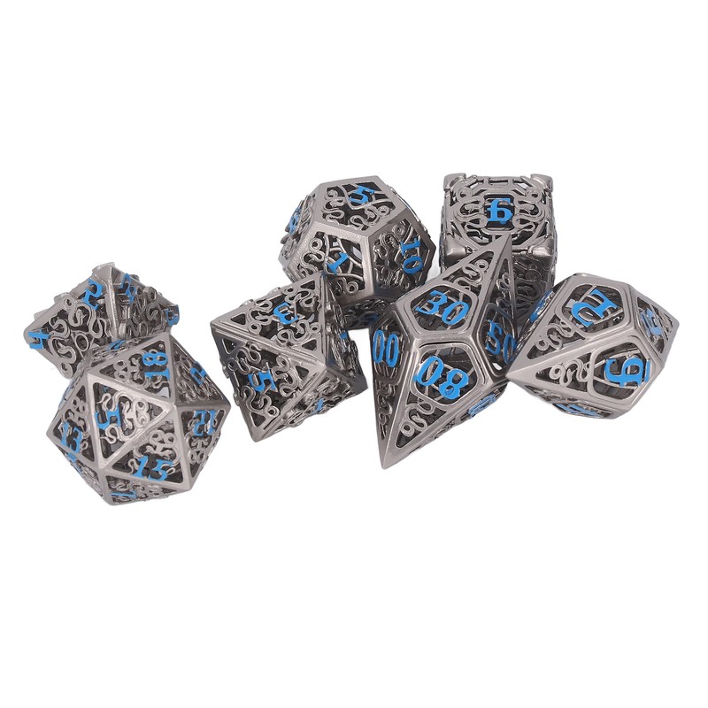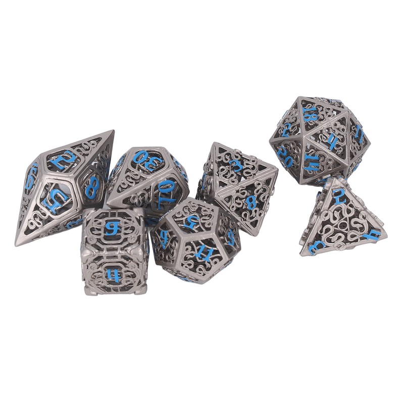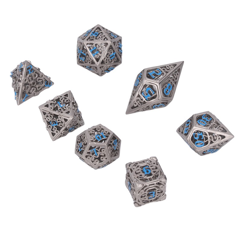 7pcs Hollow Dice Set Brass Rolling Beautiful Polyhedron Dices with Blue Numbers for Games