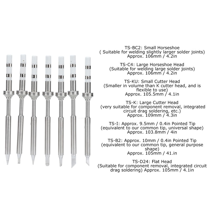 TS-I: Approx. 9.5mm / 0.4in Pointed Tip (equivalent to our common tip, universal shape) Approx. 103.8mm / 4in