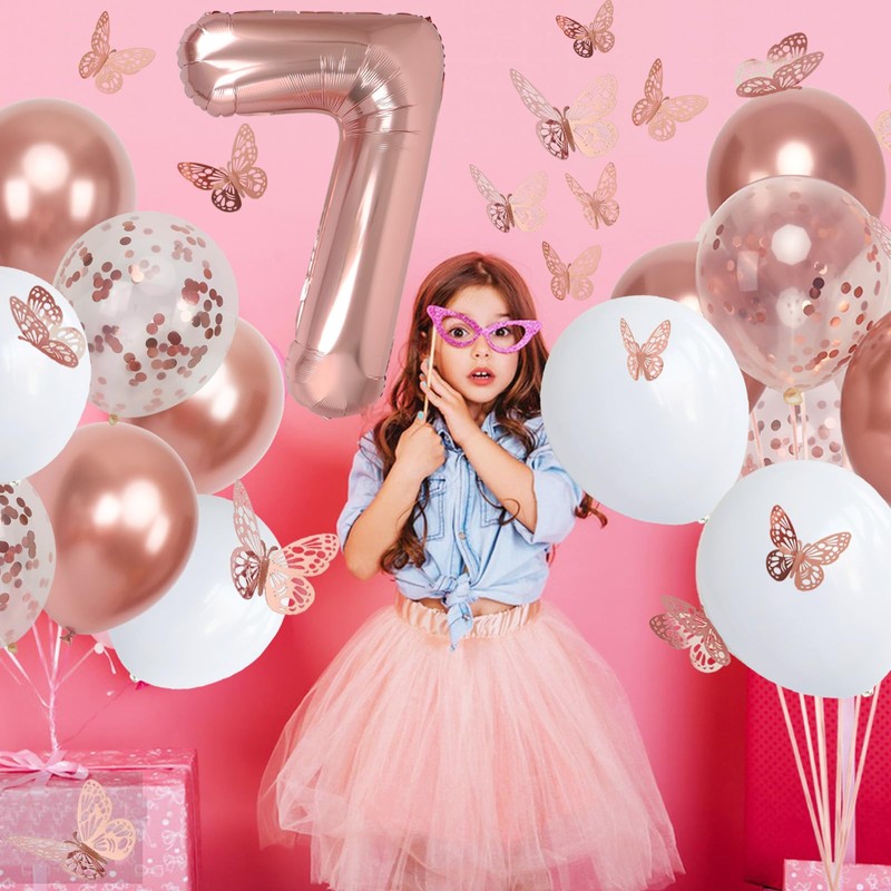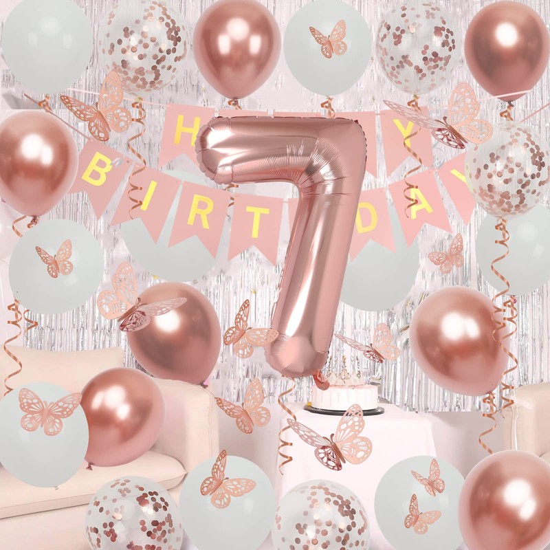 - What You Get: 1 pcs 40 in number balloon digital 7, 5 pcs 12 in metallic rose gold balloons, 5 pcs 12 in rose gold confetti balloons, 5 pcs 12 in white balloons, 12 pcs rose gold butterfly decorations, 1 roll ribbon