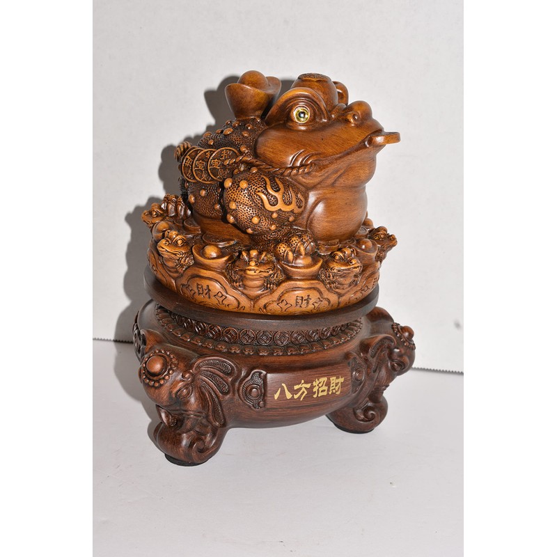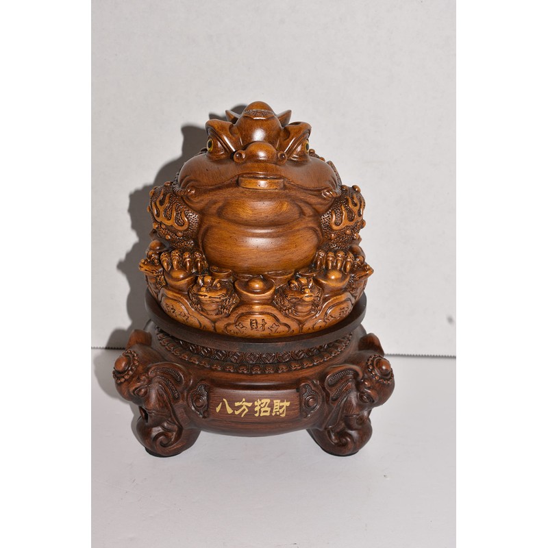 Oriental Lucky 3 legged Money Toad on Rotating Base. This Beautiful 3 Legged Toad is Sitting on a Bed of Lucky coins and Ingots, There are Baby toads with coins in there Mouths in between the Ingots. This sits on top of a rotating base that has Oriental Writing and 3 beautiful Elephant Head Feet. This is a resin material that's made to look like wood. The dimensions are approx. 8.5: tall a 6.5" in diameter. The Jin Chan, also called Chan Chuy or "Zhaocai Chan Chu", is most commonly translated as "Money Toad" or "Money Frog". It represents a popular Feng Shui charm for prosperity. The details on this piece is Amazing... You will not be disappointed!