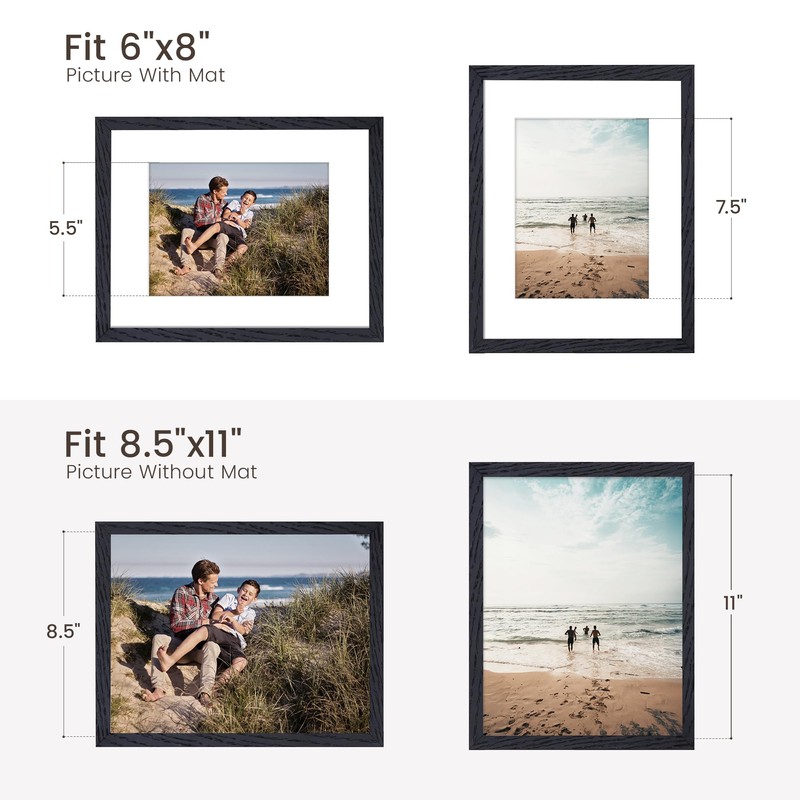 - NATURAL SOLID OAK WOOD FRAME - This 8.5x11 picture frame is made of high-quality 100% solid oak wood, the natural wood grains on this real oak wood picture frame lends it an authentic look. This poster frame comes with 1.2mm ivory mat for visualization purposes, and 8.5x11 picture frame can be matted to 6x8.